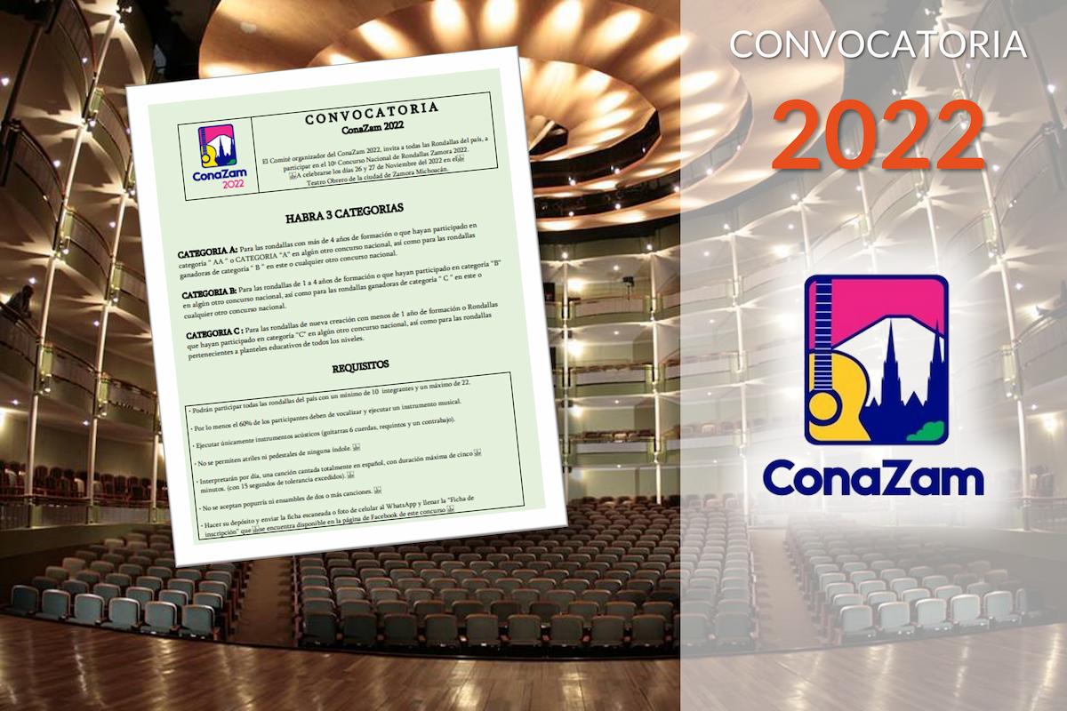 El Comité Organizador del CONAZAM 2022, invita a todas las rondallas del país a participar en el 10º Concurso Nacional de Rondallas Zamora 2022, a celebrarse los días 26 y 27 de noviembre de 2022 en el Teatro Obrero de la ciudad de Zamora, Michoacán.