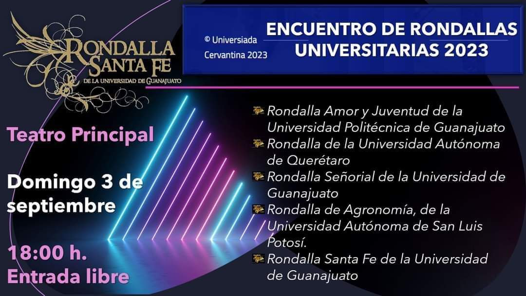 Teatro Principal de Guanajuato Cantarranas S/N, Zona Centro, Guanajuato, Guanajuato, MéxicoAsiste y disfruta del Encuentro de Rondallas Universitarias 2023, en el marco de la Universiada Cervantina 2023. Con la participación de: Rondalla Amor y Juventud de la Universidad Politécnica de Guanajuato Rondalla de la Universidad Autónoma de Querétaro Rondalla Señorial de la Universidad de Guanajuato […]